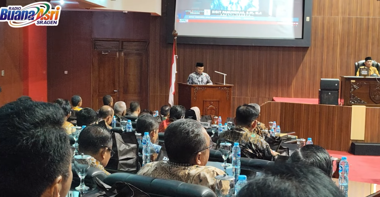 SRAGEN - Dewan Perwakilan Rakyat Daerah (DPRD) Kabupaten Sragen, Senin, 02 Juni 2025, menggelar Rapat Paripurna DPRD Kabupaten Sragen Tahun 2025, di Ruang “Rapat Paripurna” – DPRD Kabupaten Sragen, dengan agenda pertama “ Jawaban Bupati Sragen atas Pandangan Umum Fraksi–Fraksi DPRD Kabupaten Sragen atas Penyampaian penjelasan Bupati Sragen terhadap Raperda Rencana Pembangunan Jangka Menengah Daerah (RPJMD) Tahun 2025 – 2029 Kabupaten sragen.